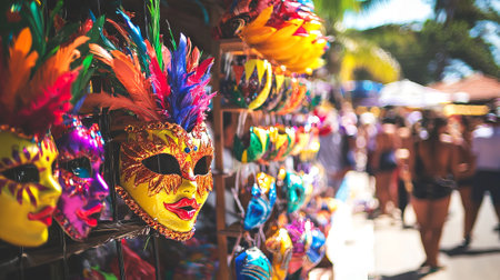 Colorful Carnival Masks on Display at Brazilian Festival. Concept of Festive Celebrations, Cultural Traditions, Artistic Craftsmanship, and Vibrant Street Markets.
