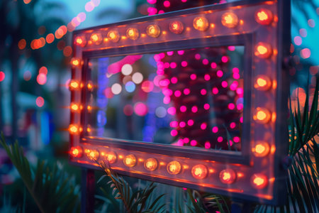 Retro lightbulb border sign on vintage cinema-style storefront under marquee lights