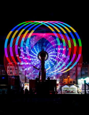 Exciting long exposure capture of vibrant amusement park rides in motion at night