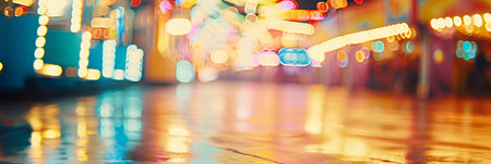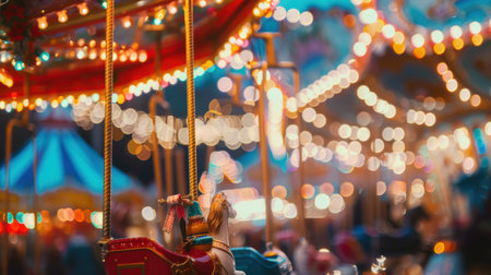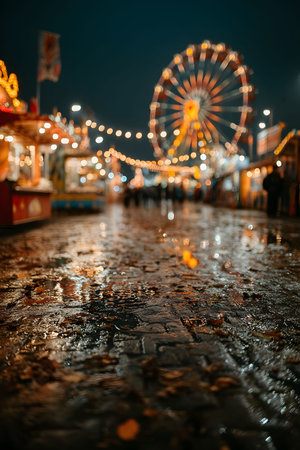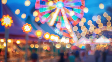 Vibrant and magical carnival atmosphere with blurred bokeh effect illuminating the night sky