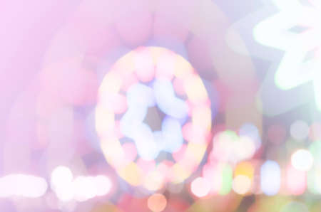 Blurry rollercoaster in bokeh, Ferris wheel at night of colorful with outdoor, Defocused (blurred) and blur image of Amusement park, The annual temple event has activities. Image out of focus