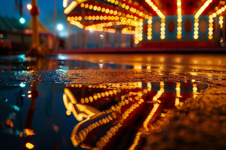 The dazzling lights of the big top tent reflected in a puddle --ar 3:2 Job ID: 473707ac-10f8-4687-9fca-744eefe796b6