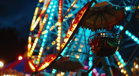 A detailed shot of a carnival or fair with colorful lights on rides and attractions, highlighting the bright and festive atmosphere of the event.