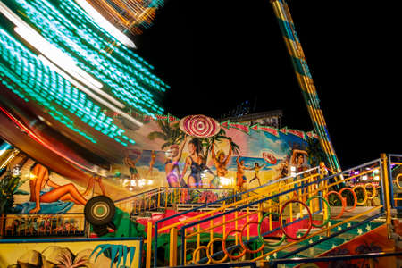 Night shots of lighted amusement rides at the Munich Oktoberfest, Munich, Germany