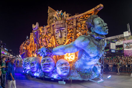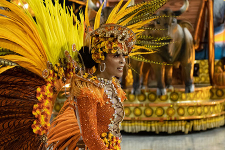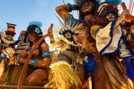 Rio, Brazil - February 23, 2020: parade of the samba school Portela, at the Marques de Sapucai Sambodromo