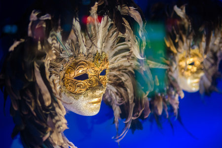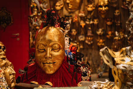 Venice, Italy - August 13, 2016: Gilded mask in a shop window in Venice, Italy. This is a national souvenir for tourists.