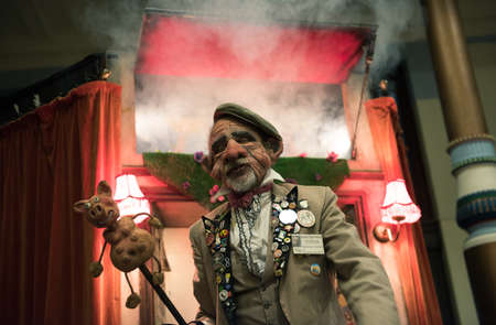 blackpool, england, 05/06/2019 A creepy face mask puppet master street entertainer in blackpool with a creepy scary dark evil puppet show to scare the children. Free street entertainment.