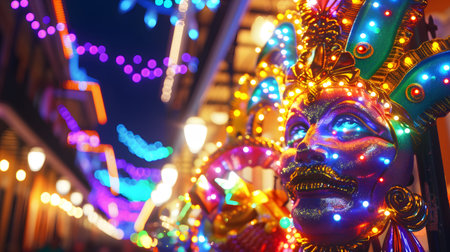 Close-up view of illuminated Mardi Gras masks glowing brightly at night. Festive atmosphere.