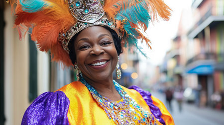Close up of a Smiling African American Woman in an Elaborate Mardi Gras Costume. Concept of Cultural Celebration, Festive Traditions, Joyful Parade. Copy space.