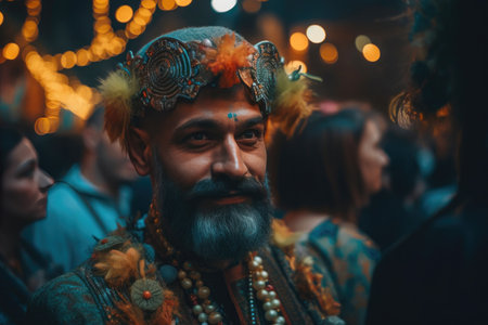 Happy man in a vibrant feathered headdress celebrating at a carnival