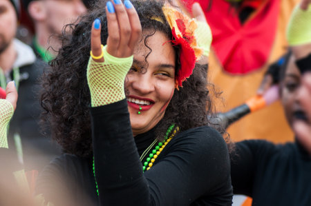 Vibrant carnival makeup, feathered costume, and joyful expression.