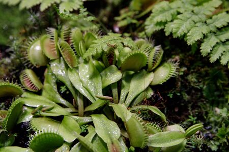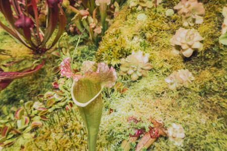 Botanical garden with carnivorous flowers. Jungle foliage stock photography. Venus fly traps and pitcher plants. Jungle foliage stock photo.