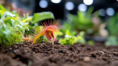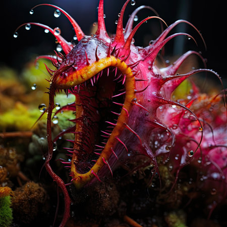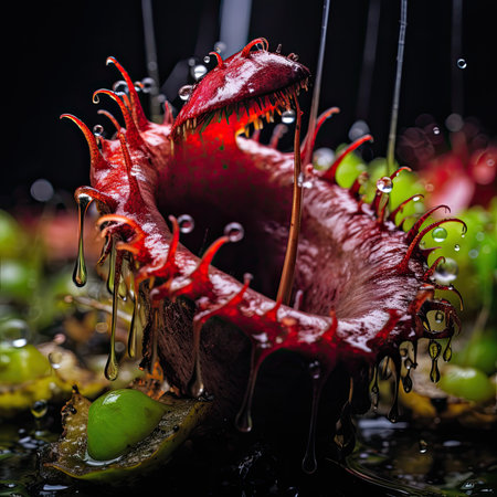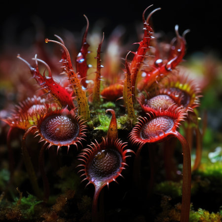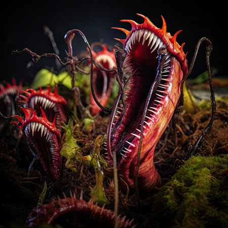 A close-up of vibrant red and green carnivorous plants, with intricate details showing the mesmerizing mandibles that catch their prey in high-definition photography style. The background is dark to highlight these unique creatures. --ar 53:30 --v 6.1 Job ID: 9f19e1d4-fb9c-43d7-952a-cc7604e0c576