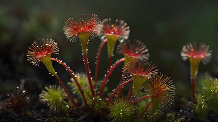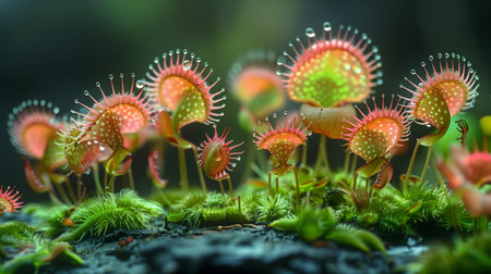 Vibrant Drosera Plants With Dew Drops Thriving in a Lush Green Environment