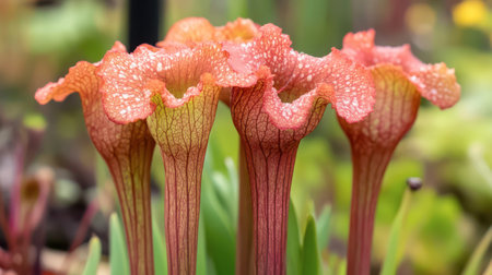 Vibrant pitcher plants stand tall in a garden, showcasing their unique shapes and colors under the soft sunlight of early spring, surrounded by lush greenery and blooming flowers.