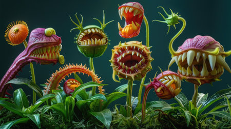 Horrifying carnivorous plants with monstrous flower heads, featuring mouths, teeth, and eyes, on green stems with leaves