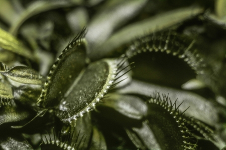 This image shows a full frame macro abstract texture view of an indoor potted Venus flytrap houseplant (dionaea muscipula).