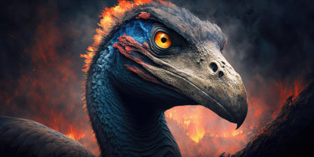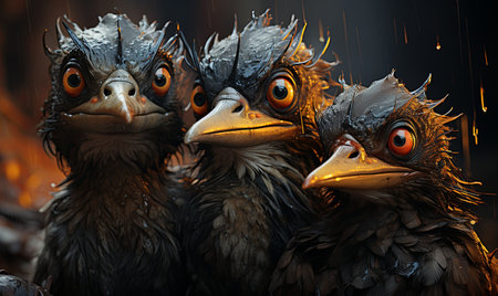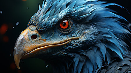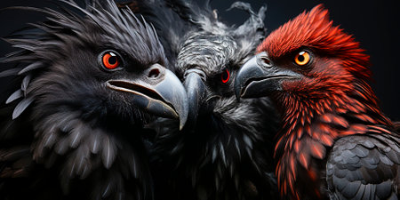 a dark fantasy bird with striking red eyes stares out from the hyperrealistic portrait. captured with the zeiss batis 18mm f2.8 and voigtlander nokton 50mm f1.5 aspherical lenses, this explosive wildlife image evokes cosmic horror and the eerie world of darksynth. keywords: bird, red eyes, dark fantasy, zeiss batis 18mm f2.8, voigtlander nokton 50mm f1.5 aspherical, hyperrealistic animal portraits, cosmic horror, explosive wildlife, darksynth. ai