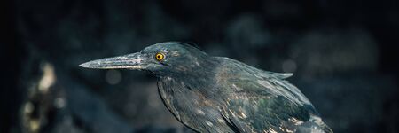Lava heron aka Galapagos heron on Galapagos Islands foraging and catching and eating food on Tortuga Bay, Santa Cruz Island. Amazing bird animals wildlife nature of Galapagos Ecuador. Panoramic banner