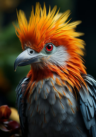 the tengu hybrid, a mythical creature with human and bird-like features, is majestically captured in this stunning portrait photograph, showcasing its vibrant plumage, sharp talons, and piercing gaze, blending japanese folklore with fantasy elements in a mesmerizing visual representation. ai generated