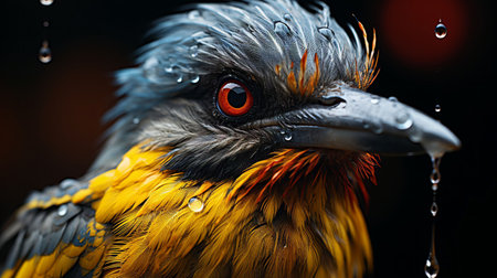 An AI generated illustration of a brightly colored bird with red eyes perched in a rain shower, looking alert