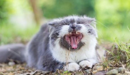 White-gray cat with wide open mouth lying in grass outdoors. Yelling or shouting cat.