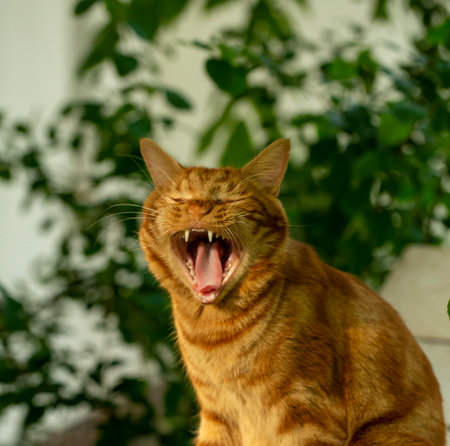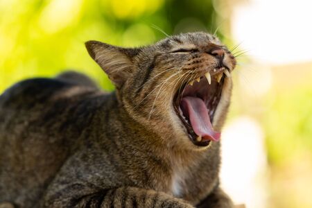 Stripes domestic cat yawns. Lazy pussycat is sitting near windowsill. Close up animal portrait. Sunlight in window.