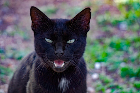 Close-up of an aggressive black cat with open mouth, tongue and teeth. Wild and mad cat concept.