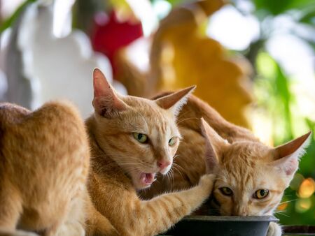 Street cats eat food from the package. Protection of animals. Care for abandoned and hungry animals. Selective focus.