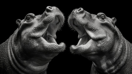 A powerful hippo opens its mouth wide in a vibrant jungle showcasing raw beauty and wildlife.