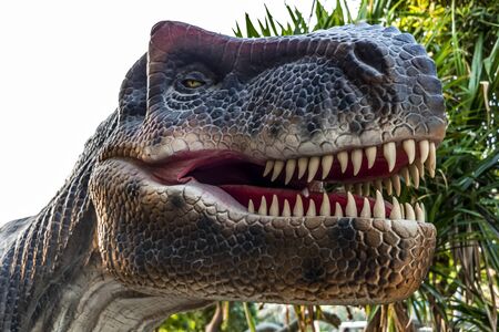 A dinosauris shown in a scene from the jurassic world. Dinosaur model in the park. Giant tyrannosaurus at an exhibition in the park