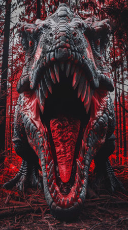 A detailed view of a dinosaur with its mouth wide open, showcasing its sharp teeth and powerful jaw muscles. The image captures the prehistoric reptile in a menacing pose, ready to strike or vocalize in its natural habitat.