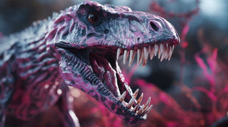 A close up of a dinosaur with sharp teeth, AI