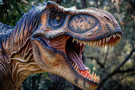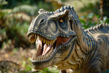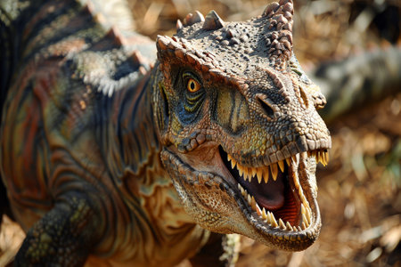 A detailed view of a dinosaur displaying its open mouth, showing its teeth and formidable presence.