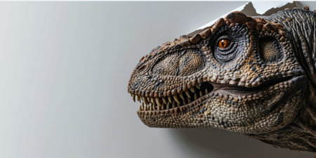 A detailed close-up view of a dinosaur with its mouth wide open. This image can be used to depict prehistoric creatures, dinosaur exhibitions, educational materials, or for adding an element of adventure to creative projects.