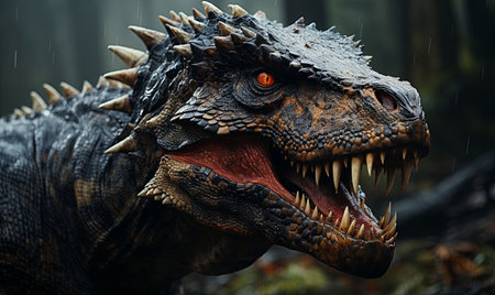 AI Generated. a fierce dinosaur emerges from the shadows showcasing its powerful jaws and intense gaze