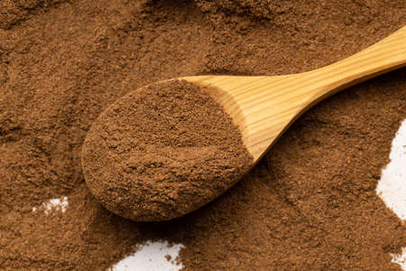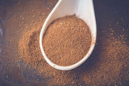 There is a silver teaspoon with patterns in a jar with delicious fragrant crumbly cocoa powder. An invigorating delicious drink in the morning. Top view.