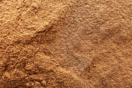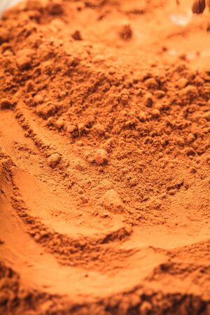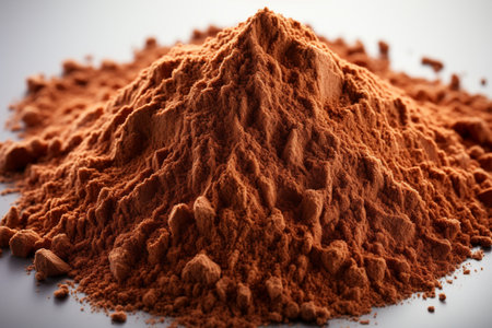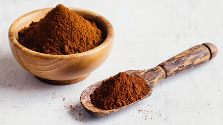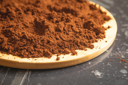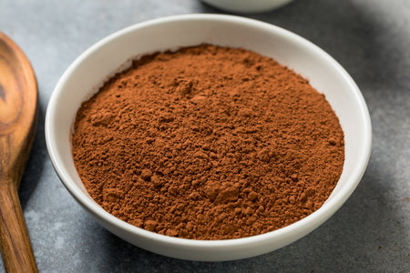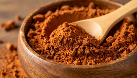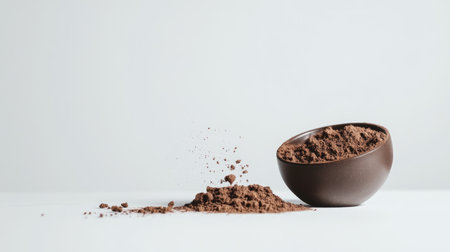 A stylish image of ground cocoa powder in a bowl with some spilled on the surface, showcasing the rich brown color and fine texture, perfect for cooking and baking.