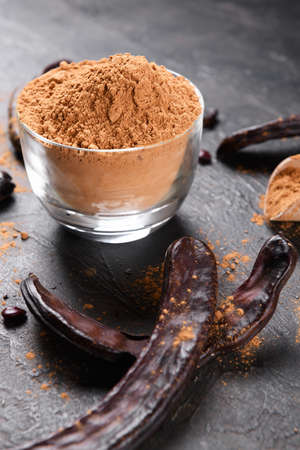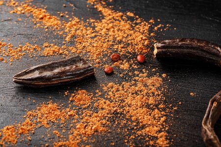 Carob carob fruit with powder on black background. Blast the Sweet powder from the pulp of the pods. Substitute cocoa and sugar, chocolate patients with diabetes and overweight people.