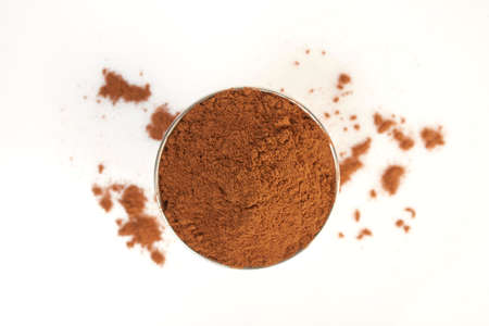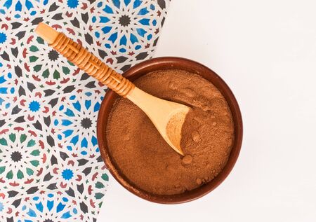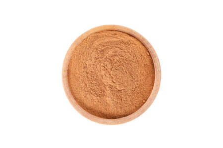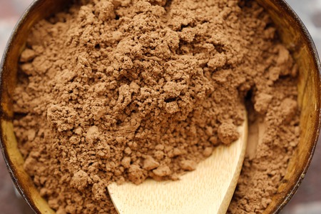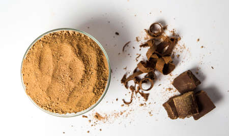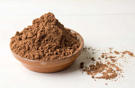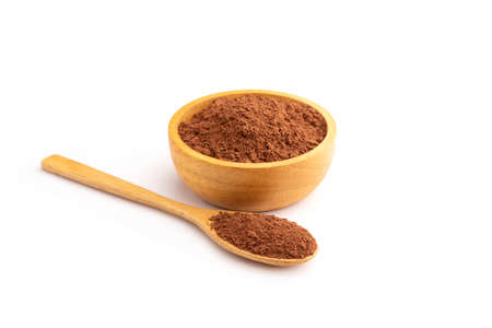 Cocoa powder or chocolate powder in wooden bowl isolated on white background