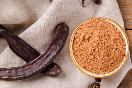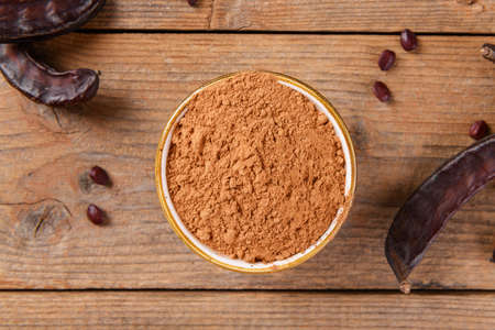 Dry carob pods and carob powder over wooden background. Organic healthy ingredient for vegan vegetarian food and drinks, view from above