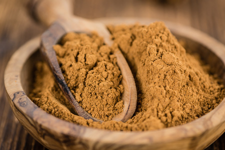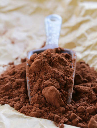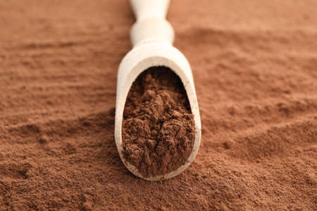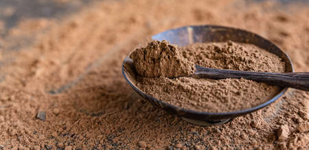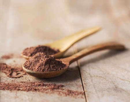Cocoa or chocolate drink powder in wooden bowl, photographed with natural light, copy space on the top (Selective Focus, Focus through the middle of the chocolate powder)