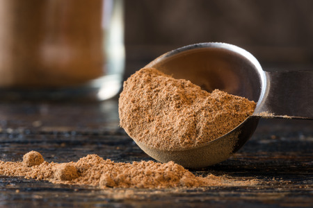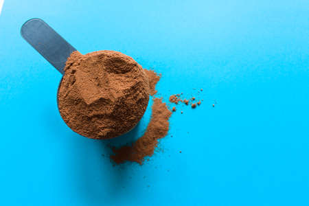 Scoop with whey protein powder. Sport food supplement and gym diet