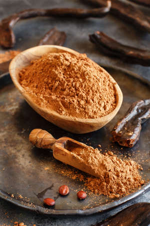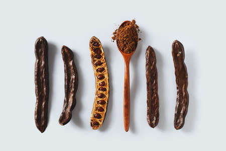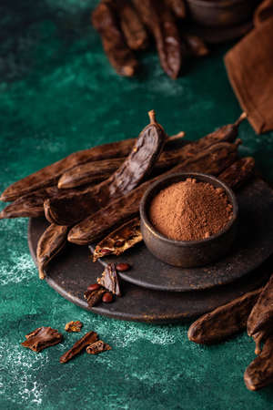Carob Powder and Pods Ready to Use in Spoon. Organic Food.