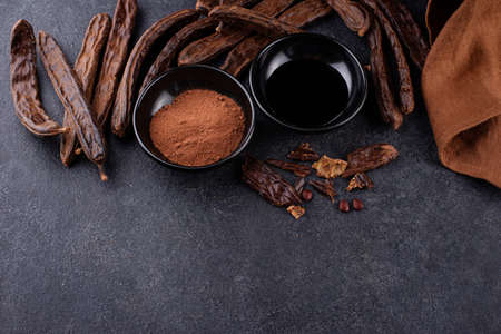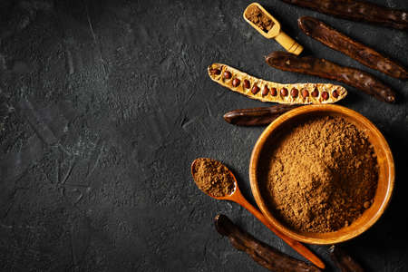 Carob bean and powder in bowl flat lay on black background, top view, copy space