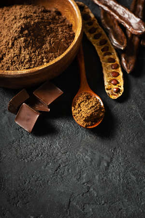 Carob bean and powder in bowl flat lay on black background, top view, copy space, vertical