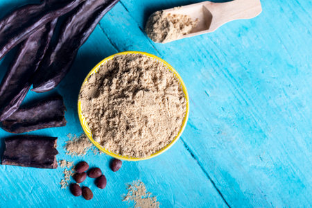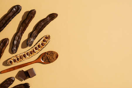 Carob bean and powder flat lay on yellow or brown background, top view, copy space