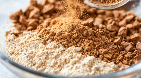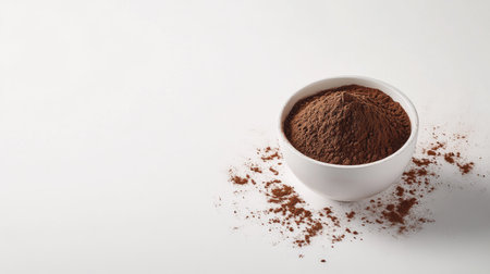 A close-up of a bowl filled with cocoa powder, accented by spilled powder on a clean surface. This image evokes the essence of baking and dessert preparation.
