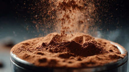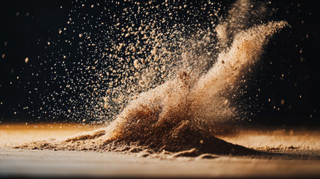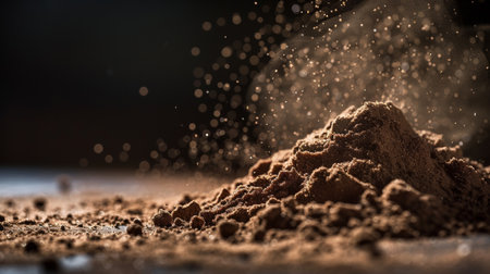 Cocoa powder splashing in a dark environment, capturing its texture and movement. Perfect for themes related to food, cooking, and ingredients.