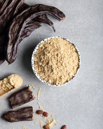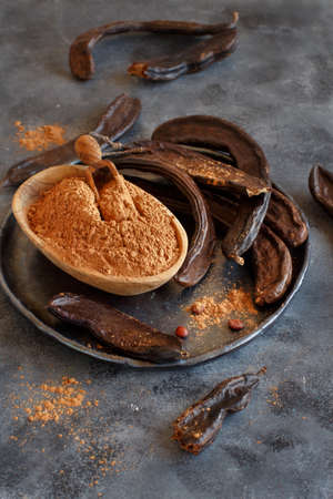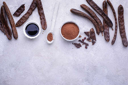 Carob bean and powder flat lay on gray background, top view, copy space,